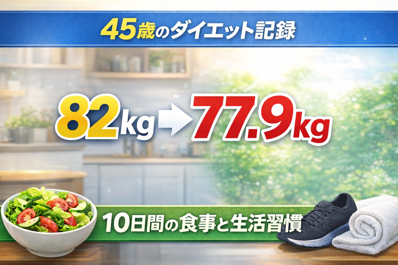 ダイエット開始から10日間で、体重は 82kg → 77.9kg(−4.1kg)。